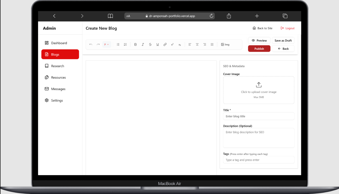 Academics and researchers needed a simple, secure way to publish and manage research notes, long-form content, and curated learning resources with fine-grained access control. Built a lightweight CMS with role-based access control, markdown/MDX support, SEO optimizations for long-form content, and an admin dashboard for content publishing and analytics.